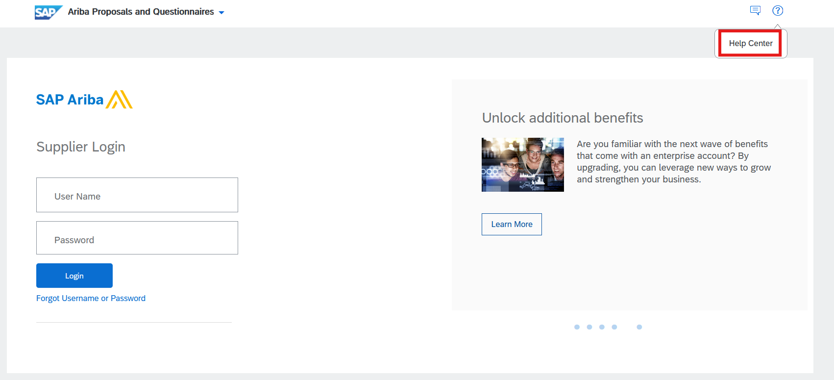 1. Login to your account. You can either click on the link in the email invite from SEPRO or login via this link: sarawakenergy.supplier.ariba.com. Click on the "?" icon on the top right corner of the login page.