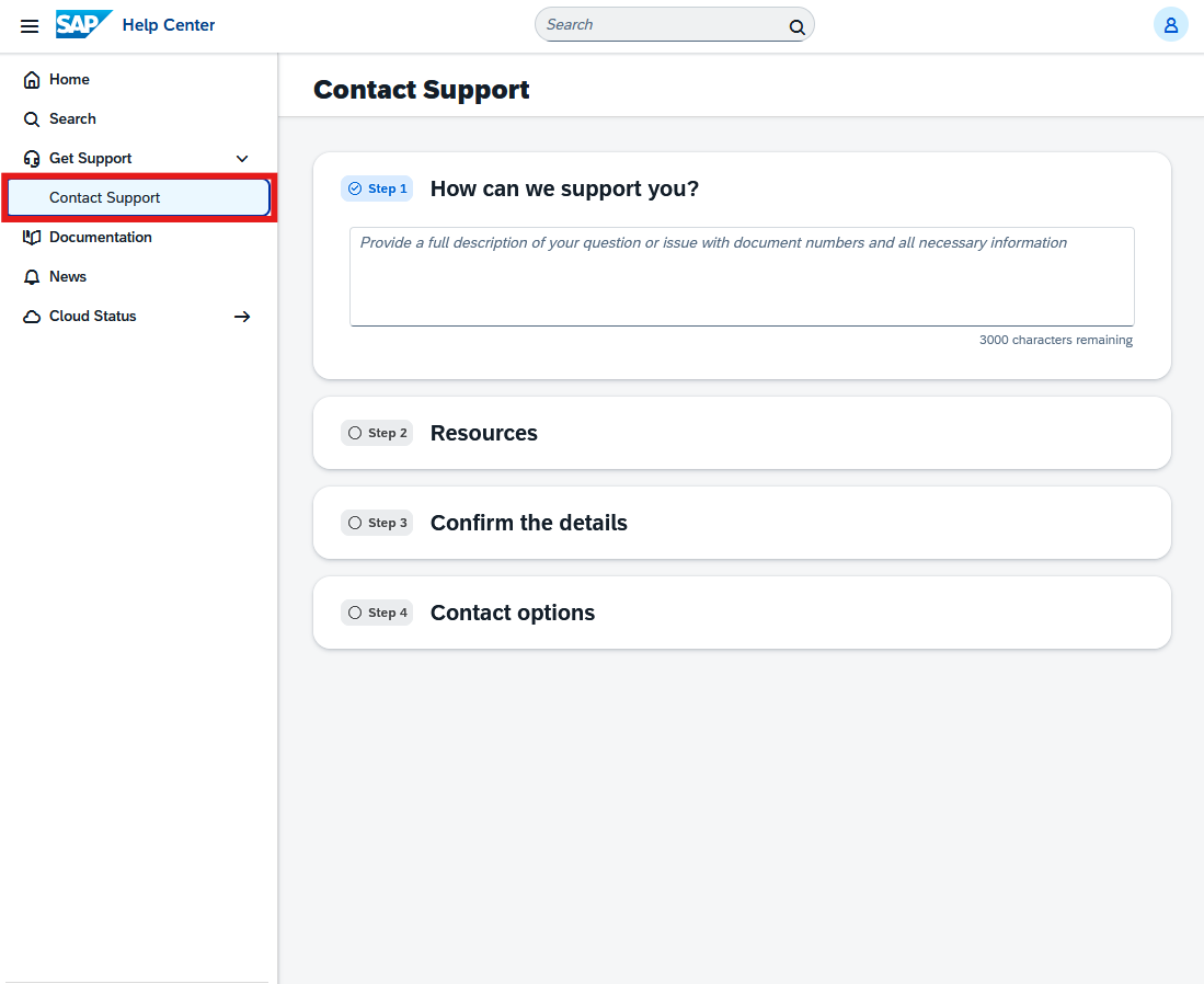 3. A new page will open. Click Contact Support, complete all required fields, select your preferred contact method for ARIBA Support, and submit the request once all information has been filled in.