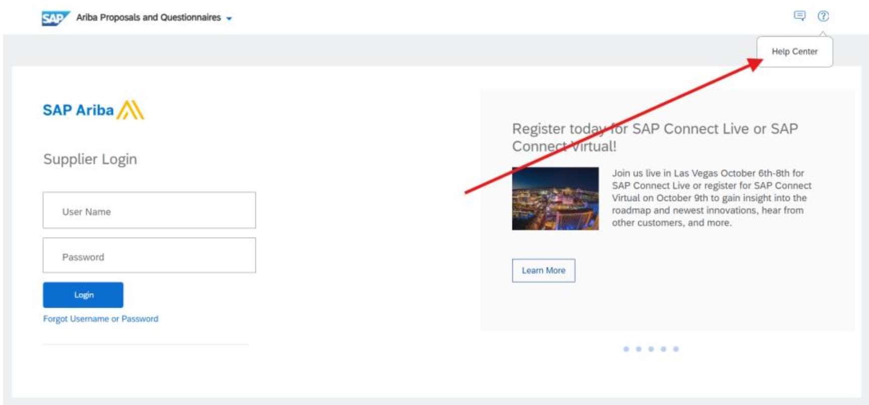 2. At the ARIBA Supplier Login, click on the ? icon and click Help Center