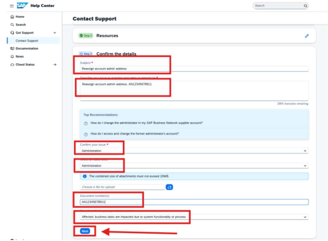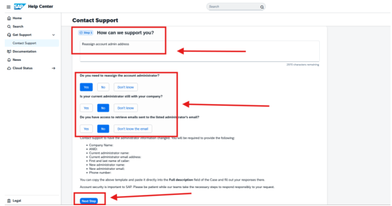 4. At Step 1, in the designated column, enter "Reassign account admin address". For the